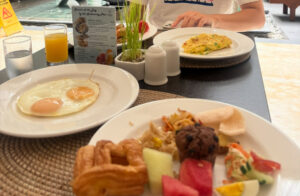 パンやフルーツ、インドネシア料理も並び、旅行中でも栄養バランスのとれた朝食が楽しめました。